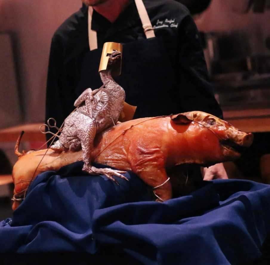Блюдо представляло из себя петуха (а точнее кастрированную птицу, жирного каплуна) и поросенка, распополамленных и сшитых воедино, а затем запеченных. Причем не было разницы, чью голову или низ использовать. Умелые кулинары аккуратно соединяли части тушек, а швы всячески маскировали, замазывая их тестом и покрывая само «существо» различными красителями для пущей необычности. Гости были в восторге, перед ними на тарелке представал мифический монстр!