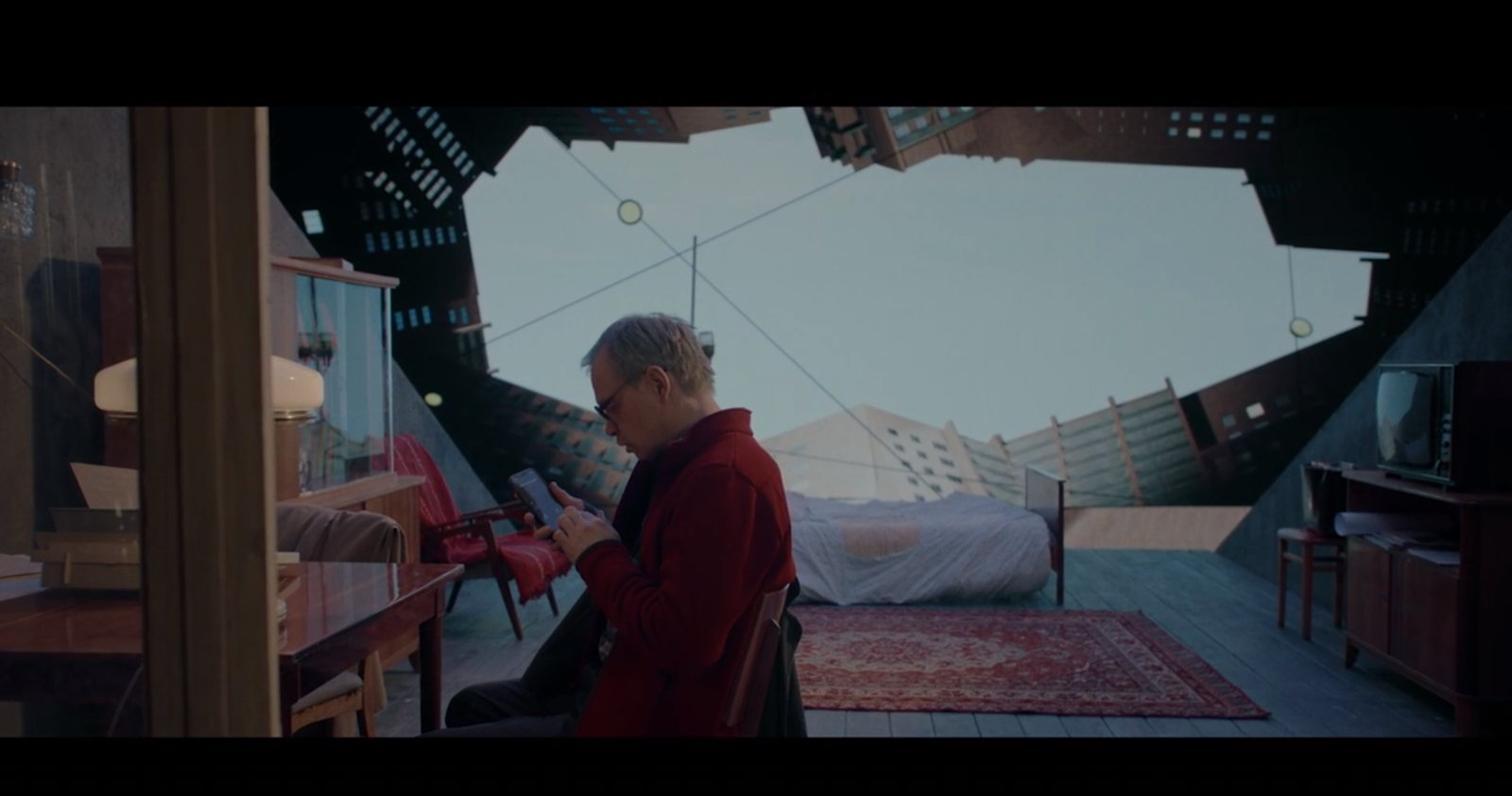 Супер: У нас был передний план фильма – декорации, построенные руками, настоящие: комната, стол, раковина, сковородка, плита. В этой обстановке существовал актер. А на заднем плане вместо реальных декораций – огромный плазменный телевизор размером, наверное, с половину футбольного поля.