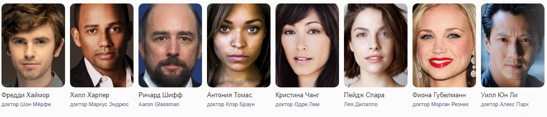Шон Мёрфи (Фредди Хаймор). Хирург-интерн с синдромом аутизма и великолепными врачебными навыками. Его болезнь мешает ему общаться с людьми и понимать их чувства. С другой стороны она позволяет сконцентрироваться на работе и выдавать одну блестящую идею за другой.