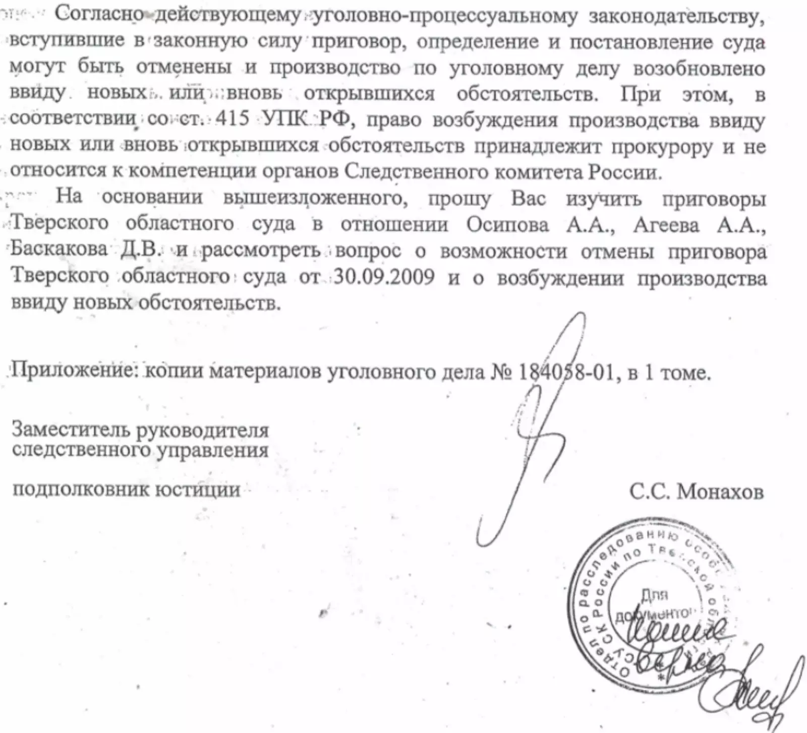 В сентябре минувшего года замглавы регионального СК подполковник Сергей Монахов направил обращение первому заместителю прокурора Тверской области Евгению Денисову (копии всех упомянутых в материале документов есть в распоряжении редакции), в котором перечислил «существенные противоречия» в приговорах Агееву, Осипову и Баскакову, установленные в ходе расследования дела. Монахов также рассказал о показаниях осужденных.