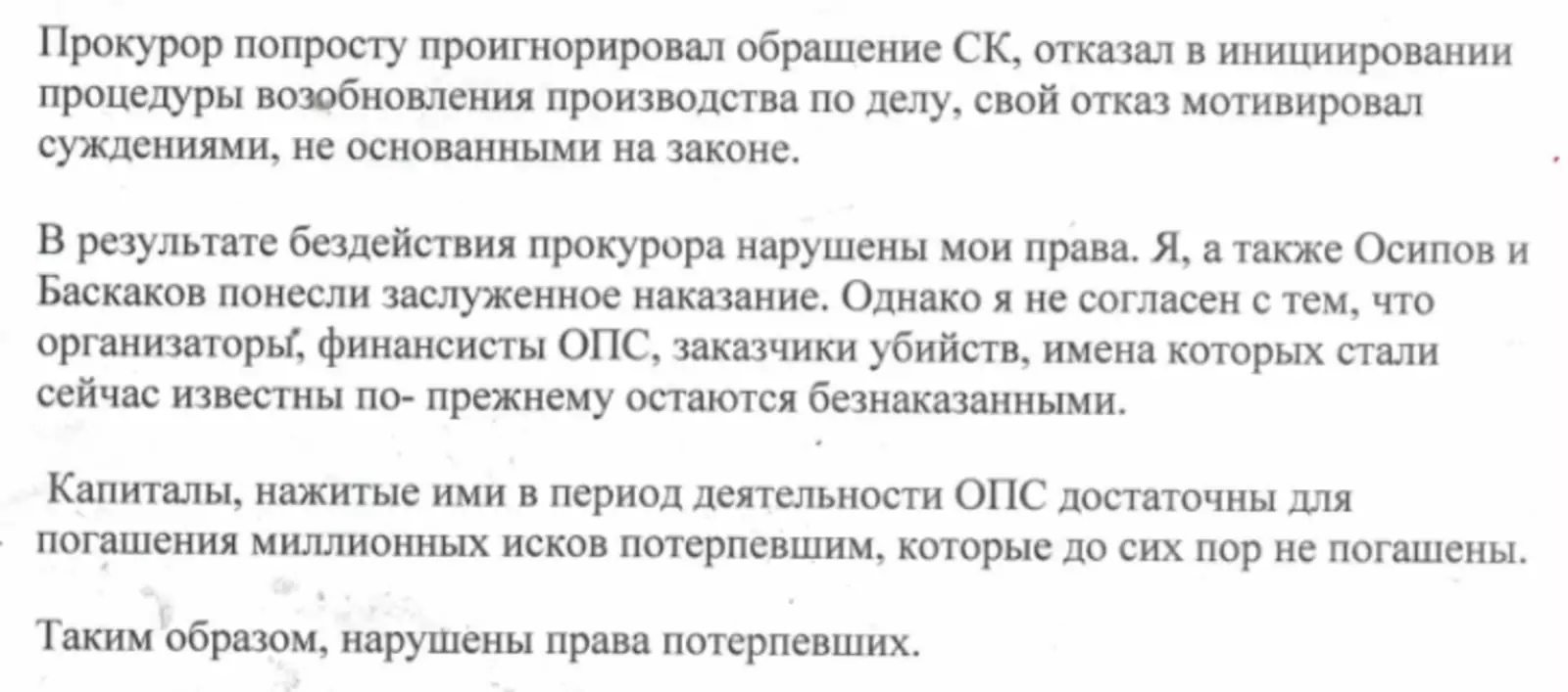 Тем временем жалобы пишут и потерпевшие, которые пытаются добиться привлечения к ответственности заказчиков и организаторов убийств их родственников. Жалоба на бездействие следственных органов была направлена в Центральный районный суд города Твери и ряд других инстанций. В качестве реакции на жалобу поступил звонок из суда: сотрудница в грубом тоне отчитала потерпевшую, потребовала забрать жалобу и порекомендовала не рассчитывать на погашение исков.