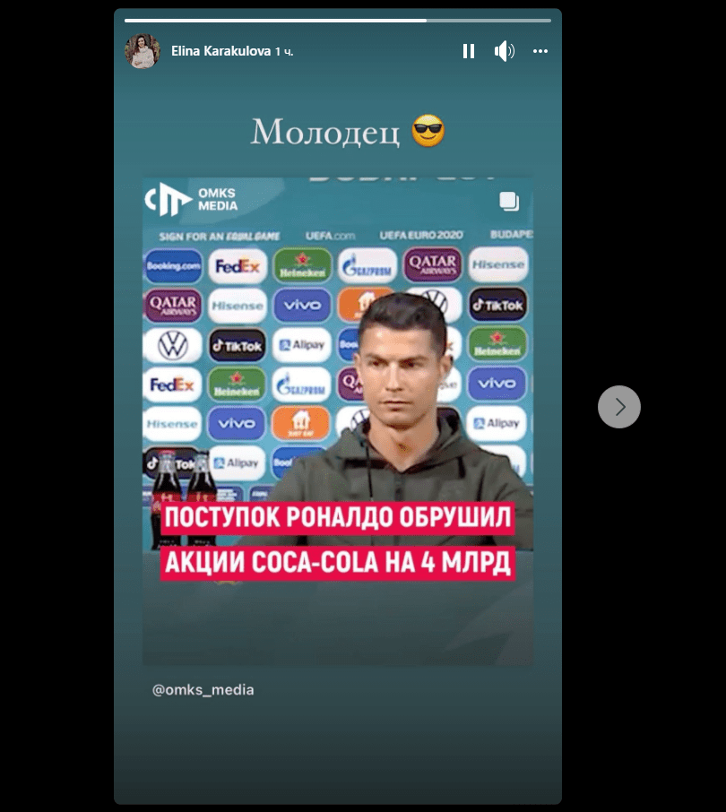 Сообщается, что жест нападающего туринского «Ювентуса» и сборной Португалии на пресс-конференций чемпионата Европы — 2020 привел к потере компанией Coca-Cola около $4 млрд. Футболист отодвинул две бутылки напитка и призвал отказаться от него, и пить воду.