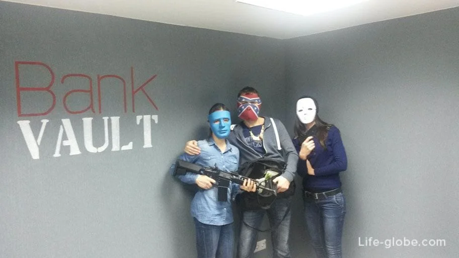 Хитро пробрались в комнату наблюдения через небольшое отверстие в двери. В комнате наблюдения разгадывали головоломки и загадки, открывали ящики с секретами, находили автоматы, отключили сигнализацию и открыли хранилище.