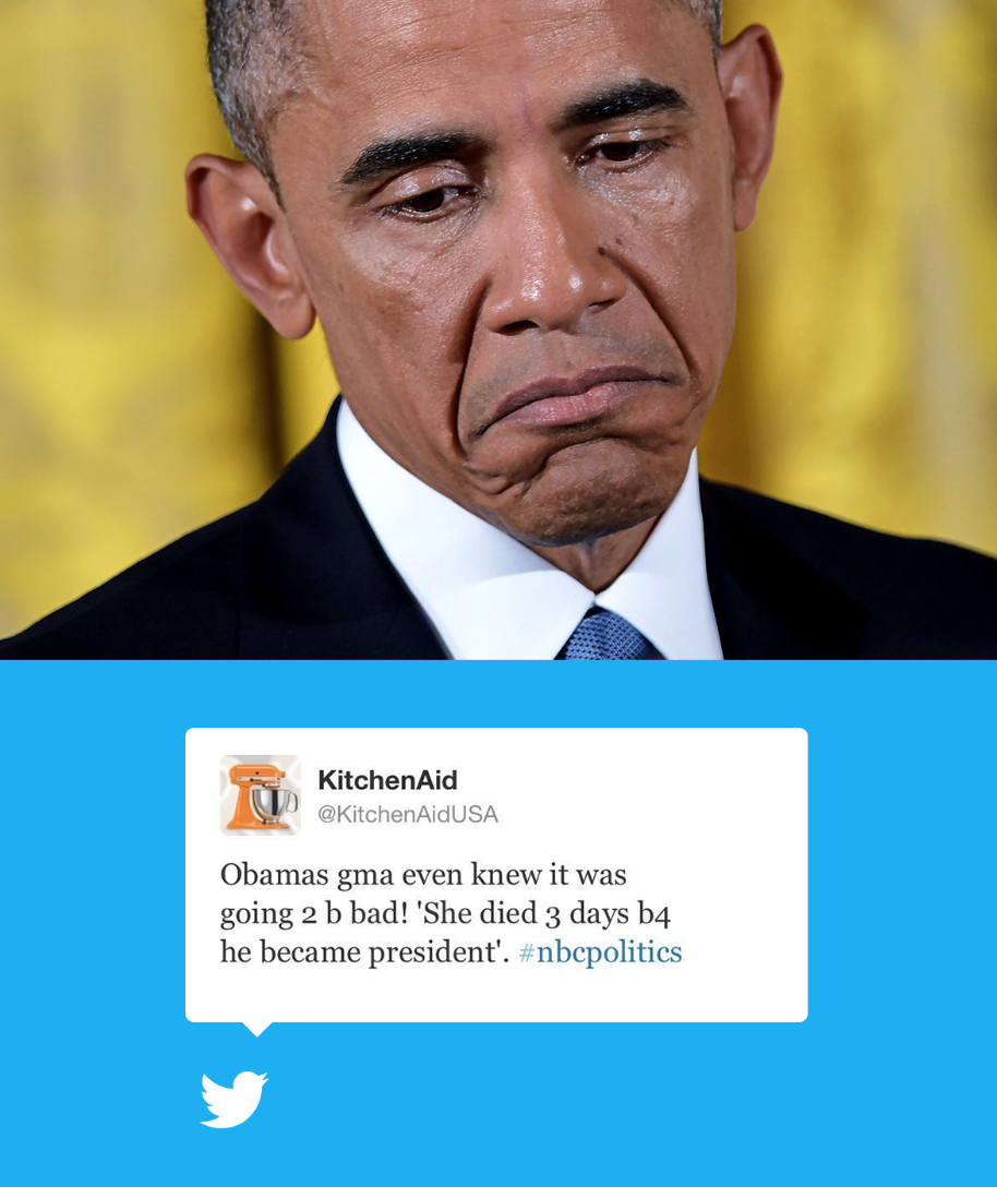 Вот у бренда кухонных приборов получилось архиплохо и они еще долго разбирали последствия. Это, кстати, еще пример плохой шутки о политике – даже противники Барака, республиканцы, не оценили шутку.