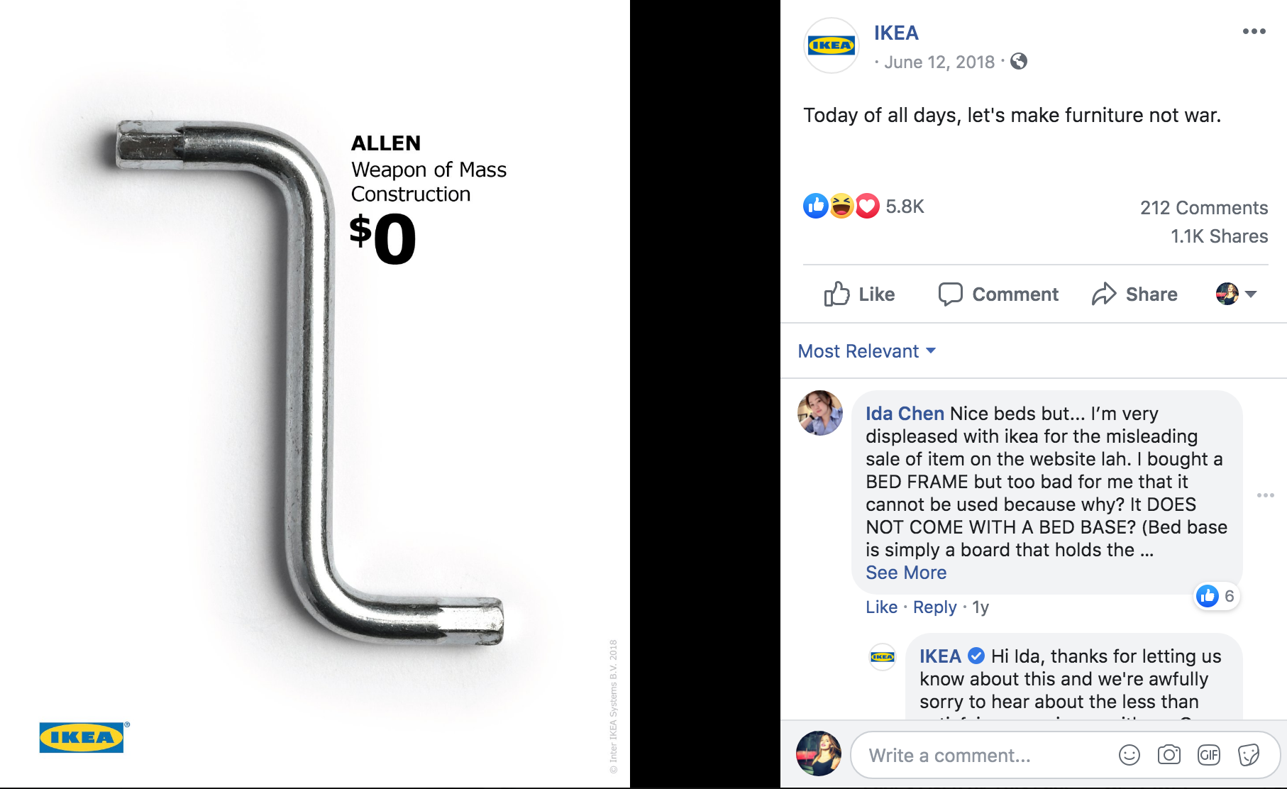 Накануне встречи Дональда Трампа и Ким Чен Ына IKEA запостили картинку ключа для сборки мебели с надписью «Оружие массового строительства» и призывом делать мебель, а не войну.