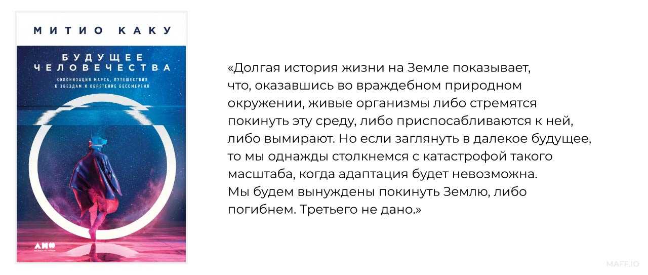 Книга «Будущее человечества. Колонизация Марса, путешествия к звездам и обретение бессмертия». Митио Каку рассуждает о возможных сценариях колонизации человечеством космоса. В этой книге он представил «дорожную карту» развития науки, которое необходимо человечеству, чтобы выжить. По мнению ученого, колонизация других планет, поиск жизни за пределами Земли и обретение бессмертия станут главными целями человечества.