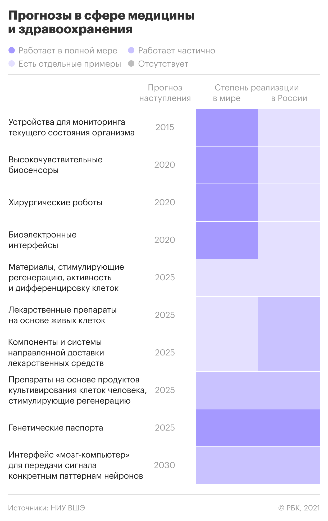 Уровень отечественных научных исследований отстает от мирового. Например, за последние десять лет выработаны лишь единичные прикладные решения в области регенеративной медицины, молекулярной диагностики, поиска новых лекарственных средств. При этом есть отдельные точки потенциального роста российских разработок — в области биодеградируемых и композитных материалов, биосенсоров, которые оцениваются довольно высоко.