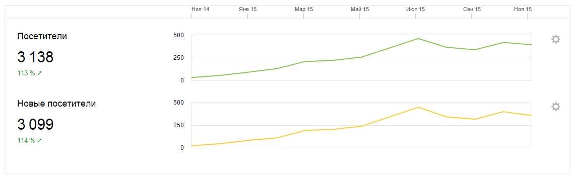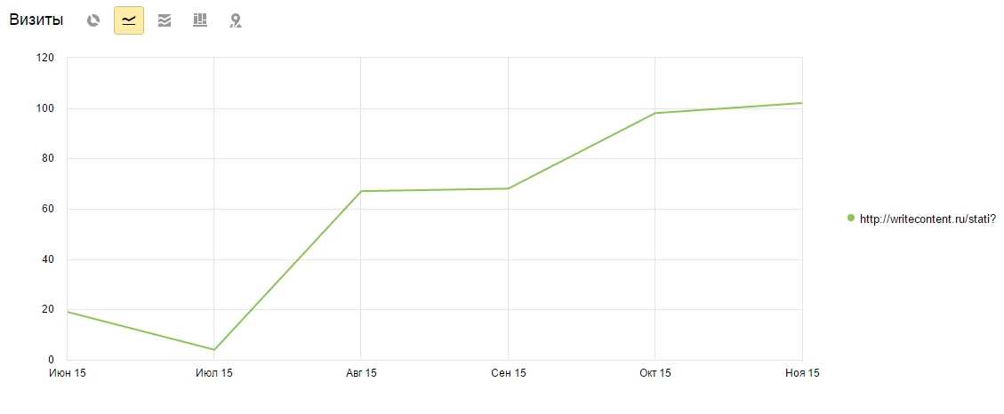 К концу ноября 2015 года трафик на страницы блога перевалил за 20% от общего показателя. Учитывая специфику отрасли и процент конверсии, для команды WriteContent показатели весьма ощутимые. Ссылки и ПФ накрутки в продвижении не используются.