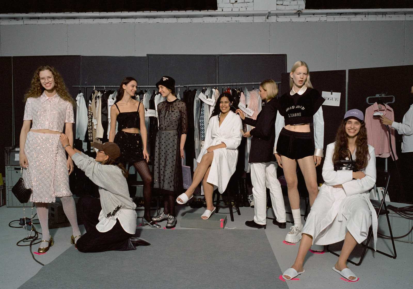 Слева направо. Анастасия Квасова, модель; Анастасия Митина, ассистент стилиста; Эсфирь Габараева, модель; Маруся Прокофьева, модель; Инаара Шеназ Нордин, модель; Юлия Точилова, визажист; Дарья Родионова, модель; Ася Горячева, модель.
