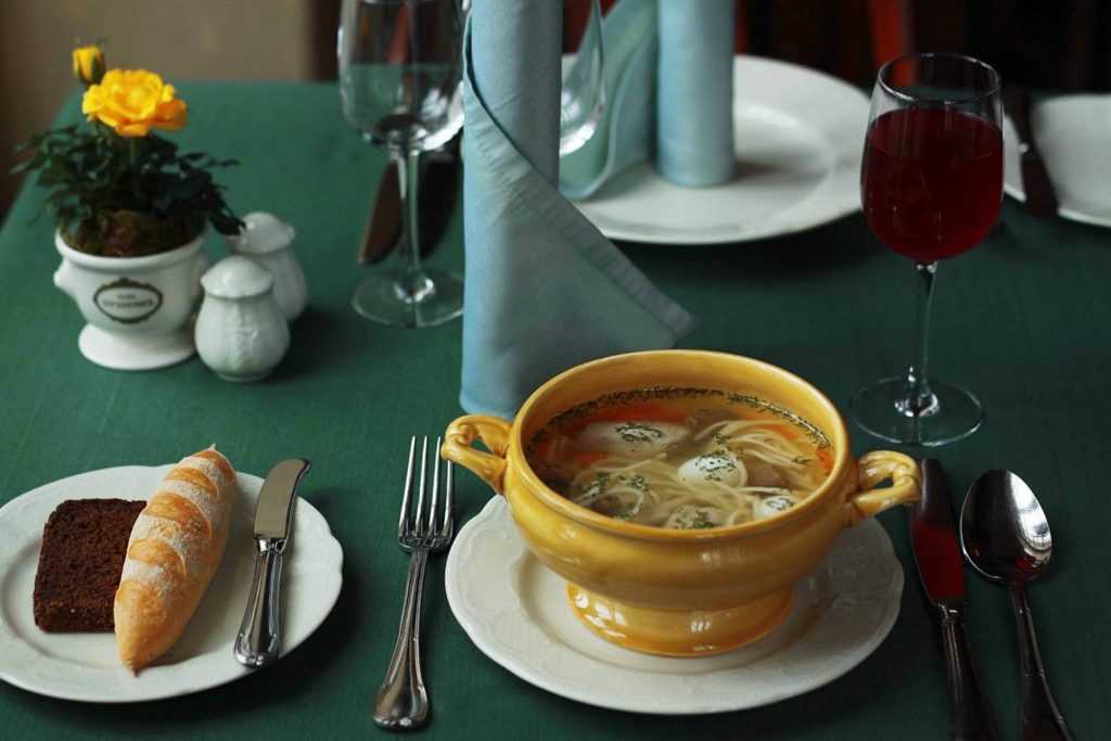 Пельмени из телятины, суп из бычьих хвостов. К каждому блюду подают свежайшие французские багеты.