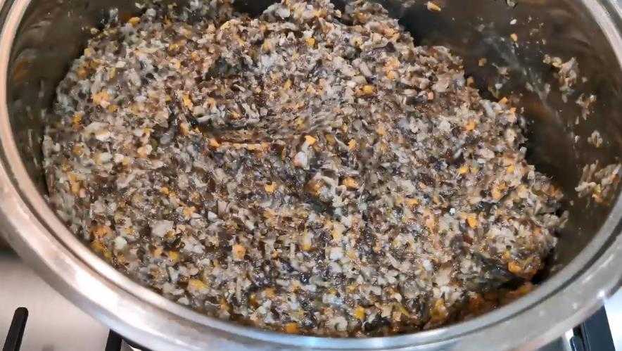 - Грибы и обжаренные овощи пропустить через мясорубку. Массу посыпать смесью перцев, протушить в течение 30 минут.