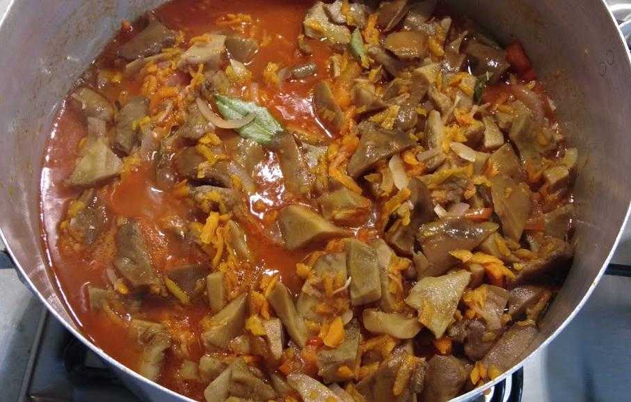 - Перемешать грибы с овощами, солью и смесью перцев в толстостенном казане. Протушить в течение 25 минут на среднем огне, в конце приготовления влить уксус.