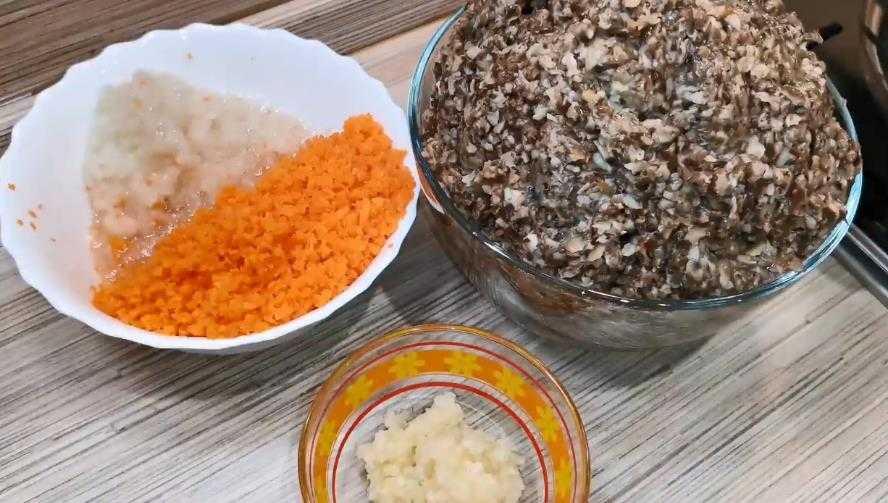 - Овощи обжарить на растительном масле до мягкости в течение 7 минут. Пропустить вместе с маслятами через мясорубку с крупной решеткой.