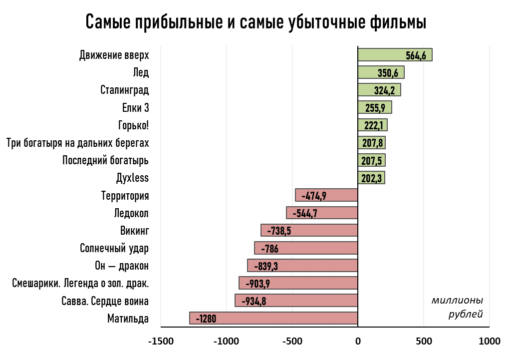 Что касается убыточных картин, то на «Матильде» создатели потеряли почти 1,3 миллиарда рублей – но бюджет вложил в картину только 280 миллионов. Съемки и выход фильма в прокат сопровождался массовым скандалом, но даже он не помог: в прокате фильм собрал всего 537 миллионов рублей, а критики восприняли его весьма неоднозначно. Потерять деньги, как оказалось, можно и на мультфильмах: «Савва. Сердце воина» обошелся создателям в 1 миллиард рублей, а в прокате собрал всего 195 миллионов, а на «Смешарики. Легенда о золотом драконе» потратили 991 миллион рублей при кассовых сборах в 261 миллион.