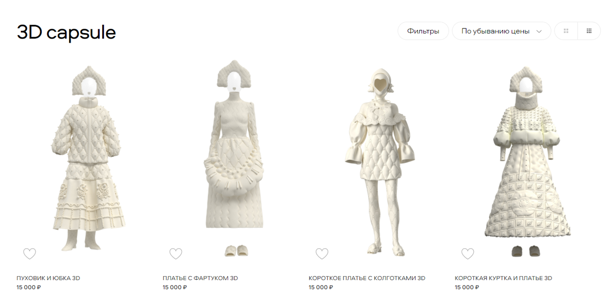 Что касается цен, то, для сравнения, капсулы с кокошниками из самой дорогой 3D-коллекции российского бренда Alena Akhmadullina стоят по 15 тысяч рублей, тогда как некоторые платья модного дома оцениваются в несколько сотен тысяч. В 2018 году известный норвежский бренд Carlings продавал вещи первой в мире виртуальной коллекции всего за 10–30 евро. На тот момент эти цены были демократичными даже для российского рынка.