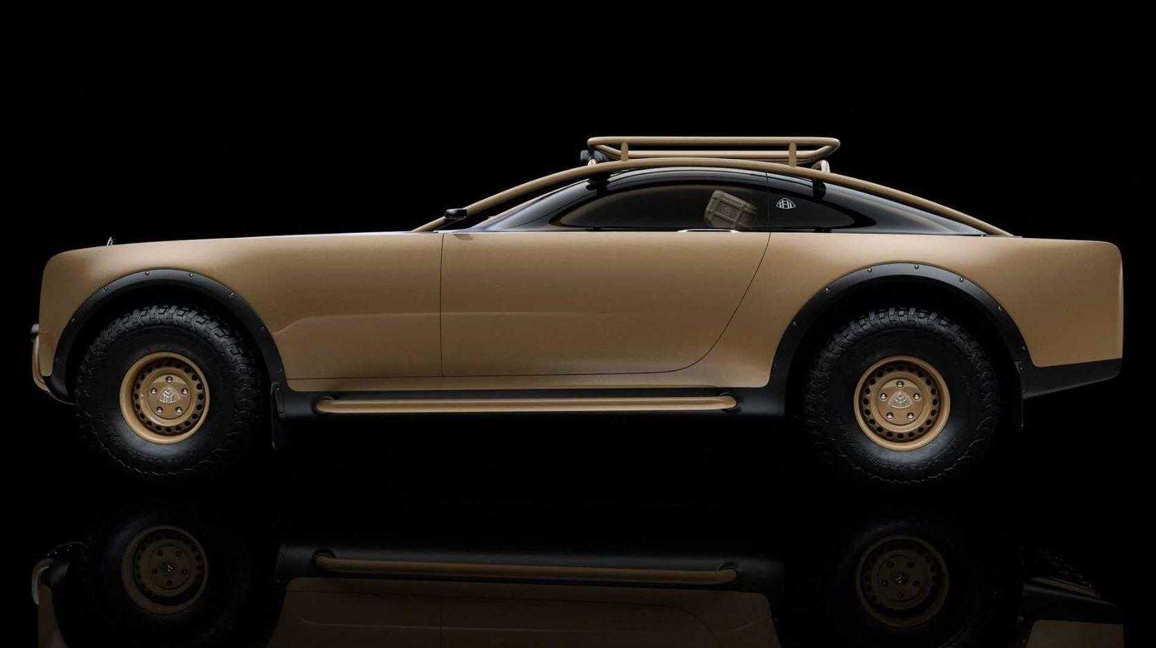Электрическое купе подготовлено для езды по бездорожью: толстые шины повышенной проходимости и наружный каркас, прорастающий вверх и вверх над кабиной. Кроме того, спереди и сзади установлены прочные металлические накладки, а над колесными колодцами — облицовка кузова с открытыми заклепками.