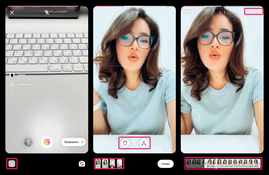 Когда вы отсняли весь необходимый материал, можно перейти во встроенный редактор. Он находится слева от кнопки записи рилс. Здесь вы можете выбирать отснятые отрывки, обрезать и удалить ненужное.