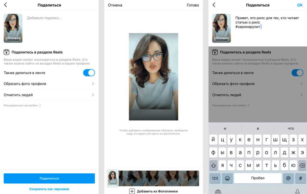 Чтобы выбрать обложку видео, нажмите на превью рилс. Можно выбрать обложку как с видео, так и с фотопленки на телефоне.