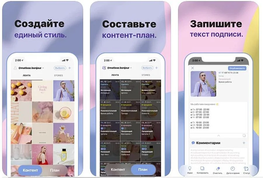 Бесплатное приложение для iPhone, которое используют не только обычные пользователи, но и владельцы бизнес-аккаунтов. В нем вы можете создать контент-план, определить цветовую гамму для аккаунта, указать нужное время публикации. Выгрузка материала осуществляется прямо с сервиса. В программе есть раздел «Вдохновение», где вы найдете подборку самых популярных профилей в Инстаграм, разбитых на тематические группы. В разделе «Обучение» собрано около трехсот уроков, посвященных брендингу, секретам продающих постов, правилам ведения блога и т.п.