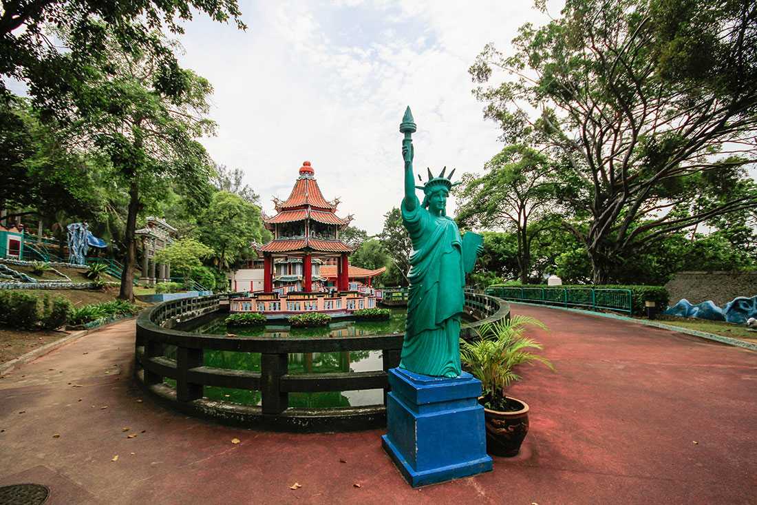 Заполняющие парк разноцветные статуи и картины (некоторые сегодня выглядят довольно запущенными) изображают сцены из китайской мифологии.