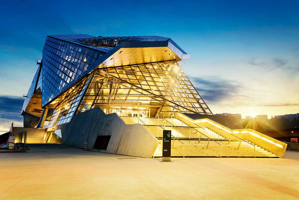 Образец современного архитектурного искусства в Лионе — Музей слияния, внешне напоминающий настоящий космический корабль из стекла и металла.