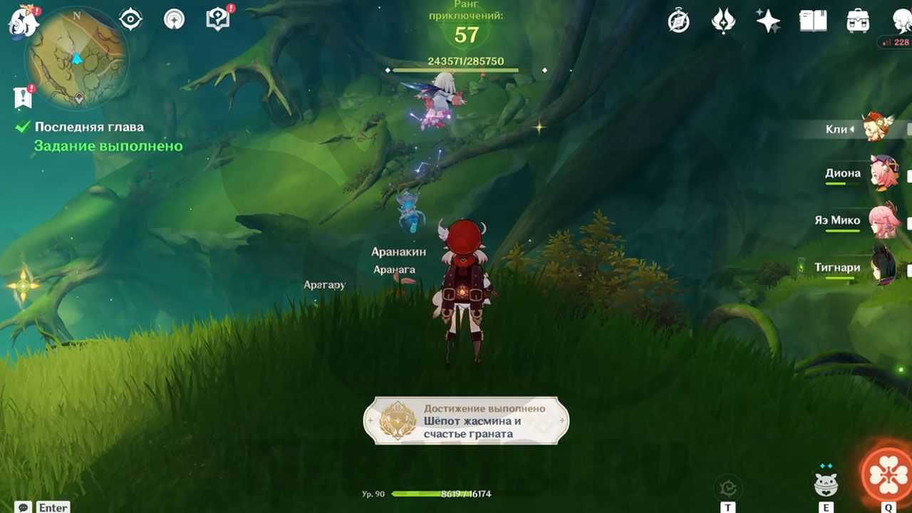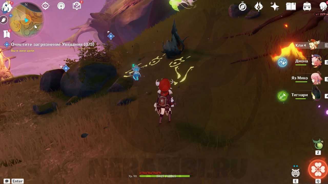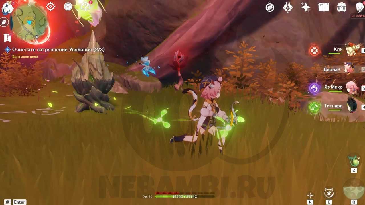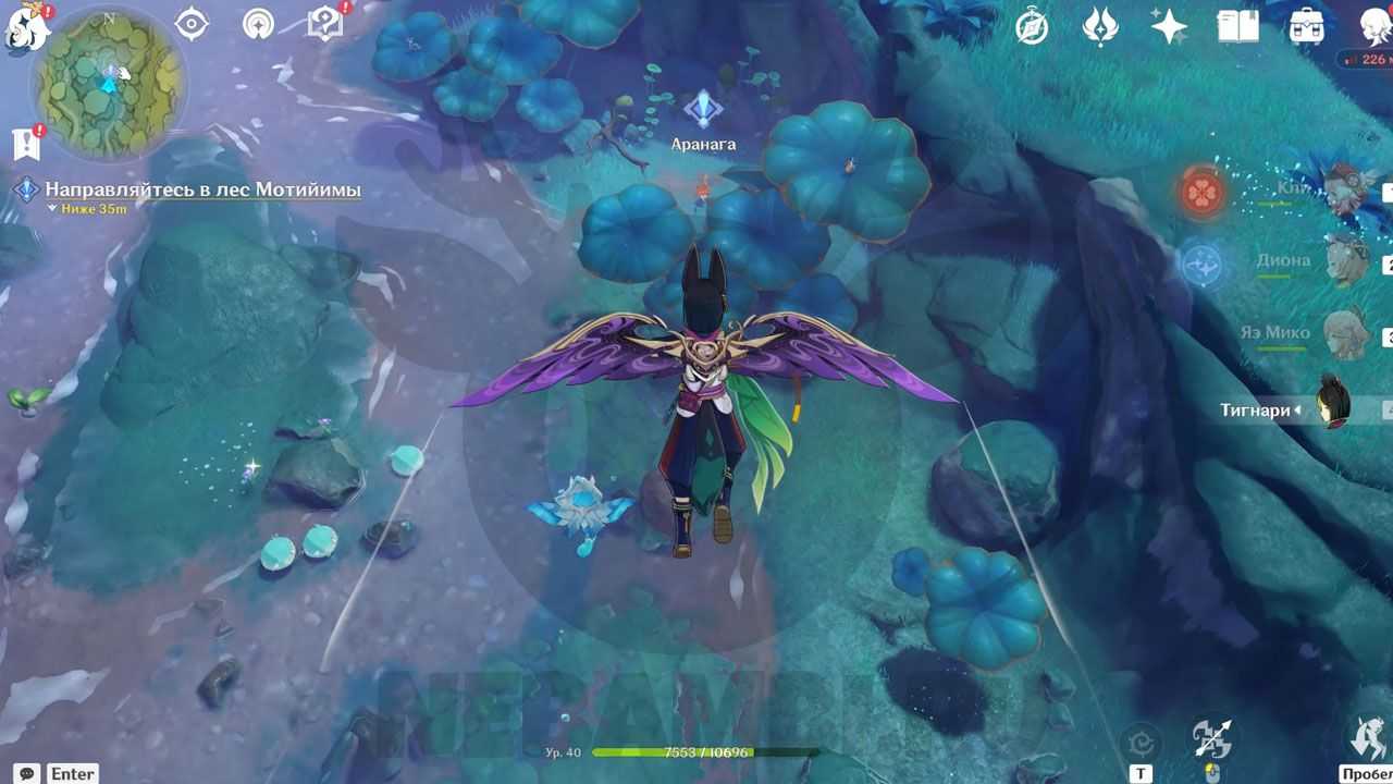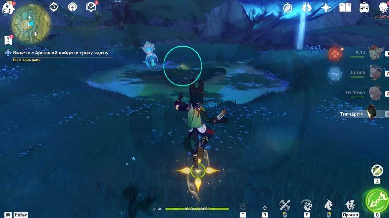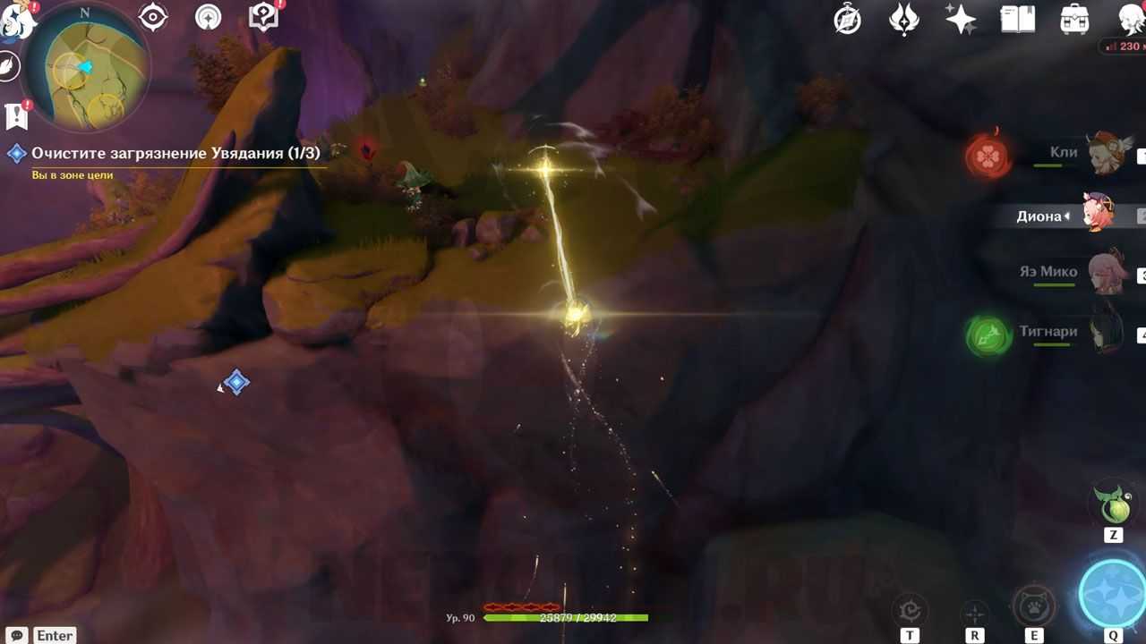 Встретив в пещере дендро фею, следуем за ней. Она будет показывать, куда нам идти по заданию и что делать.