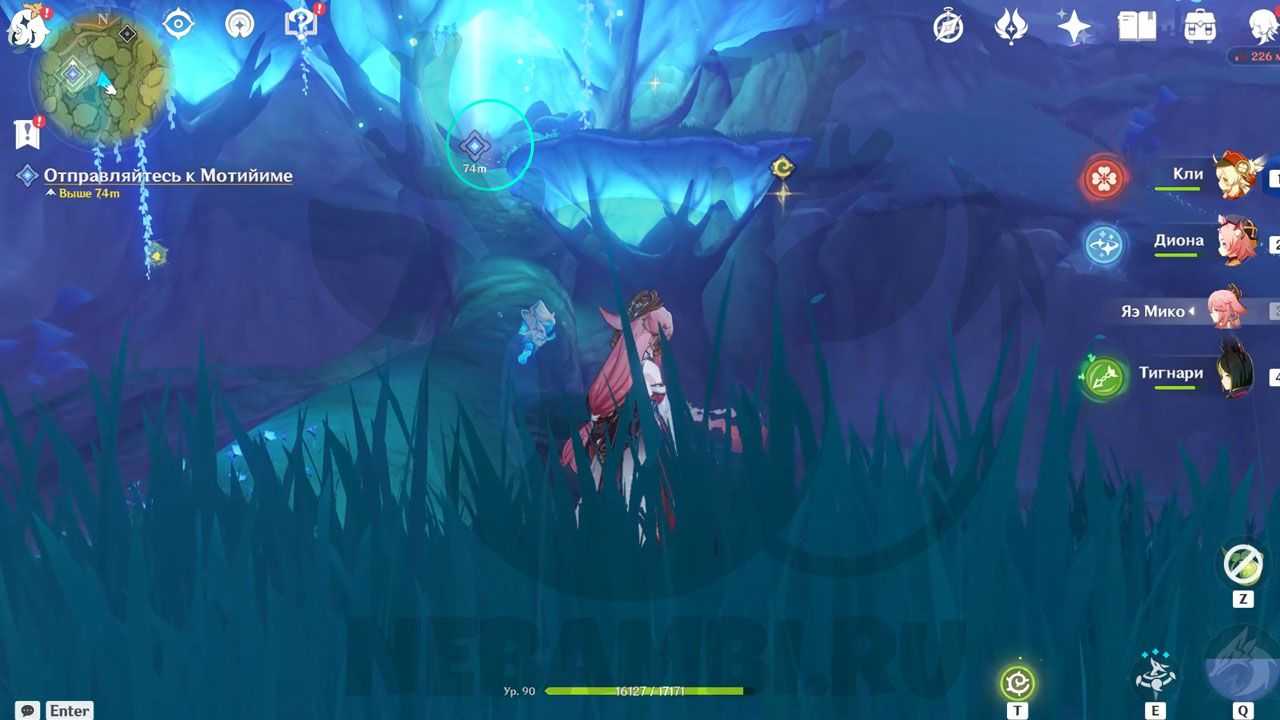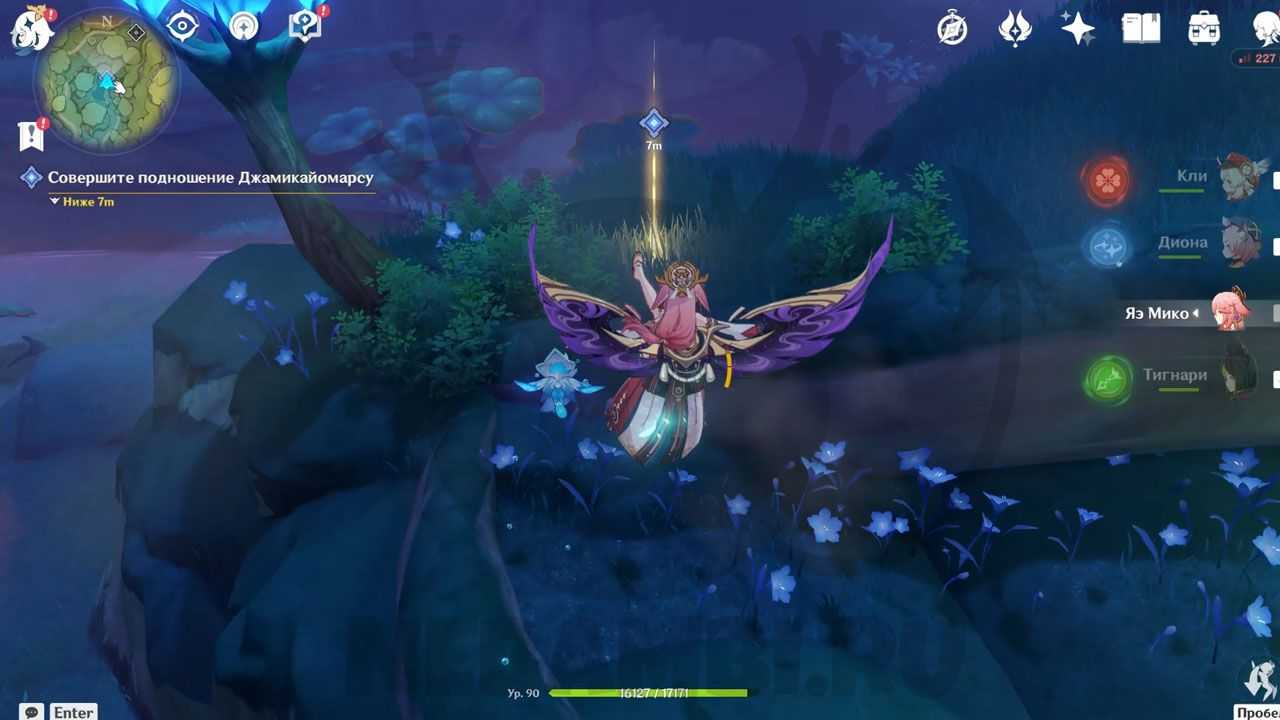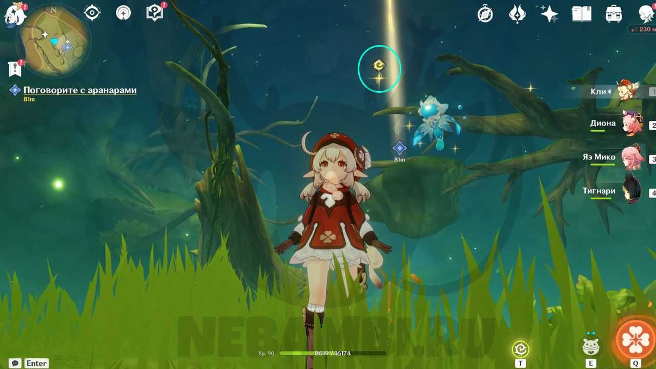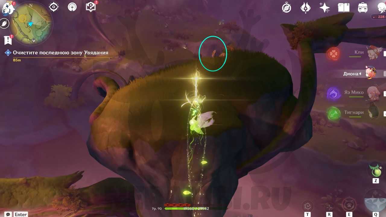 Справа от телепорта есть трамплин. Активируйте его электро-ударом и прыгайте наверх. Возьмите дендрогранум, после чего бейте дендро-стихией по луковице. При помощи светлячков перелетайте на соседнее дерево. Используйте дендрогранум на камне, после чего активируйте гриб. Заодно можете забрать содержимое удивительного сундука.
