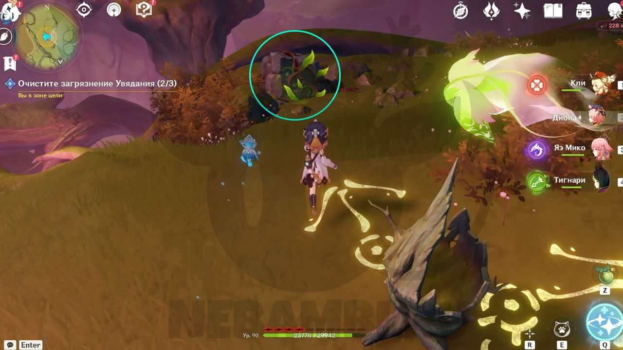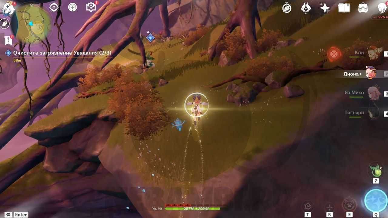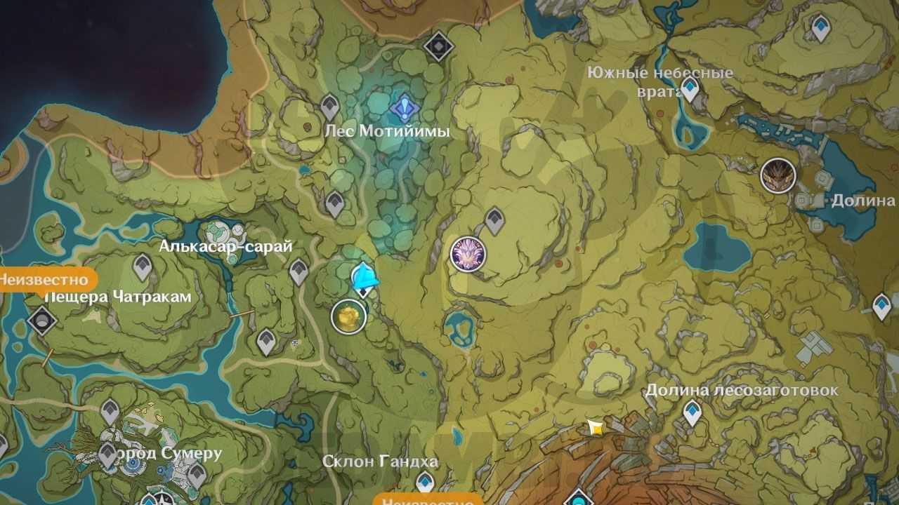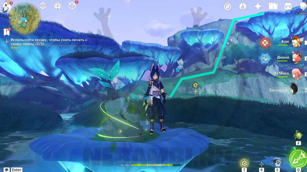 Справа от телепорта есть трамплин. Активируйте его электро-ударом и прыгайте наверх. Возьмите дендрогранум, после чего бейте дендро-стихией по луковице. При помощи светлячков перелетайте на соседнее дерево. Используйте дендрогранум на камне, после чего активируйте гриб. Заодно можете забрать содержимое удивительного сундука.