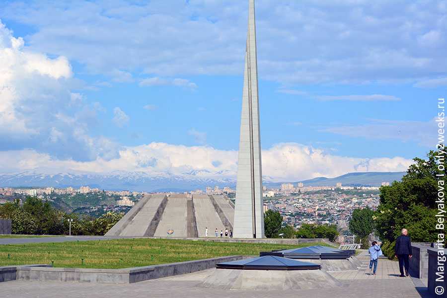 Это мемориальный комплекс жертвам геноцида армян 1915 года. Кто хорошо знаком с историей, вспомнит, что в то время было истреблено больше миллиона невинных армян. Место грустное, но очень значимое для армян, люди до сих пор приходят сюда, чтобы возложить цветы к мемориалу.