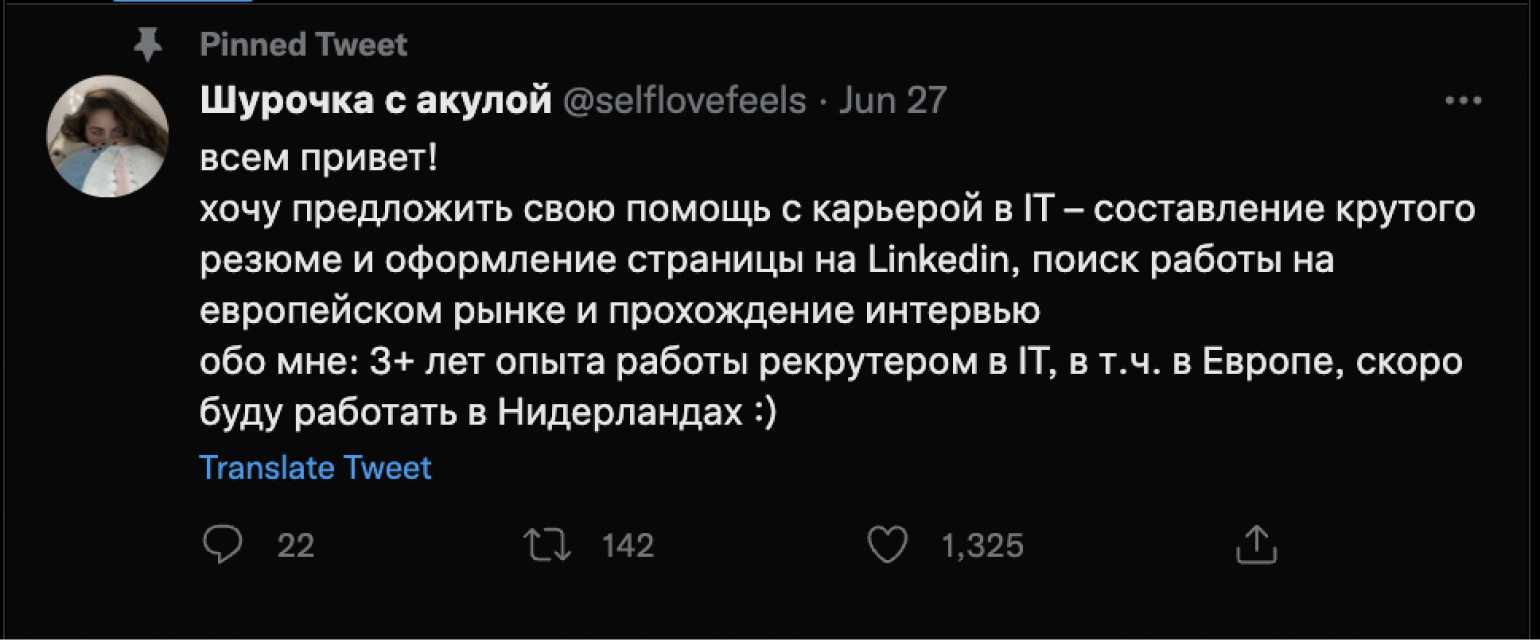 Ещё одна девушка из Twitter, начинающий рекрутер, вышла на работу к моим бывшим работодателям просто потому, что познакомилась со мной. Она отучилась в «Яндексе» и пришла ко мне на консультацию по резюме, а ушла с оффером. На прошлой неделе она начала работать в компании, которую я люблю и в которой проработала год HR-директором. У нас случилось полное совпадение по ценностям и культуре, это было очень круто.