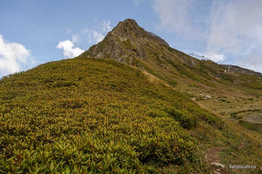 Вершина Каменный столб (2509 м) — высшая точка хребта Аибга. Здесь оборудована смотровая площадка с обзором на 360′.Попасть на вершину можно, купив прогулочный билет на канатные дороги Розы Хутор. Уточняйте в кассе или инфо-центре по телефону, открыт ли данный маршрут в ваш день.Поднявшись на Розу Пик (2320 м), вы можете проследовать по грунтовой дороге (зимой — трасса Явор), мимо канатной дороги «Эдельвейс» и затем «Тундра», к нижней станции «Крокуса». На кресельной канатной дороге «Крокус» подняться к смотровой.Второй вариант более спортивный: не пользоваться кресельной канатной дорогой и от Розы Пик пройти весь путь пешком (вначале по трассе Явор, от развилки у верхней станции канатки «Тундра» — по трассе «Фиалка»). Этот маршрут составит 2.5 км в одну сторону, набор высоты 250 м.