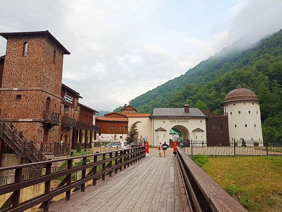 Культурно-этнографический центр «Моя Россия» расположился в самой дальней части курорта Роза Хутор. От конечной остановки общественного транспорта нужно пройти по набережной, не переходя реку, мимо концертного зала Rosa Hall и далее через парковку каршеринга. (Адрес: Набережная Лаванда, 9)Вход в комплекс платный. На территории расположились 11 павильонов, архитектурно соответствующие историческим постройкам разных регионов нашей страны. Внутри павильонов проходят выставки, мастер-классы. Есть кафе, магазинчики с национальными товарами и небольшие гостиницы. Экспозиции периодически меняются, но есть и постоянные.Если вы планируете подъем на канатной дороге Розы Хутор, то билет в Этно-парк в тот же день может быть включен, уточняйте в кассе.
