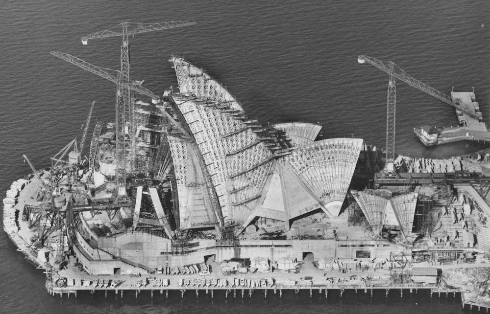 На поиск верного решения у архитектора уходили годы. Внесенные в ходе строительства изменения увеличили вес здания. Построенный в гавани Сиднея фундамент пришлось взорвать и заменить новым. Технология строительства оказалась затратной и сложной: не было плавучей подъемной техники. Материалы для покрытия кровли доставлялись по спецзаказу из стран Европы. Каждую из 2000 закрепляемых секций кровли изготавливали по отдельным индивидуальным эскизам.