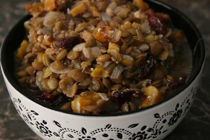Этот необычный салат готовится из чечевицы или красной фасоли, абрикосовых сухофруктов игрецких орехов, приправленных растительным маслом.