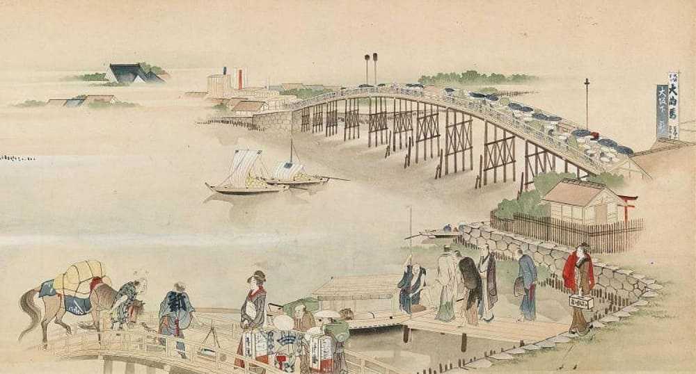 К.Хокусай «Панорама реки Сумида» (фрагмент свитка, мост Рёгоку)Местонахождение: Музей Хокусай-Сумида, Токио, Япония