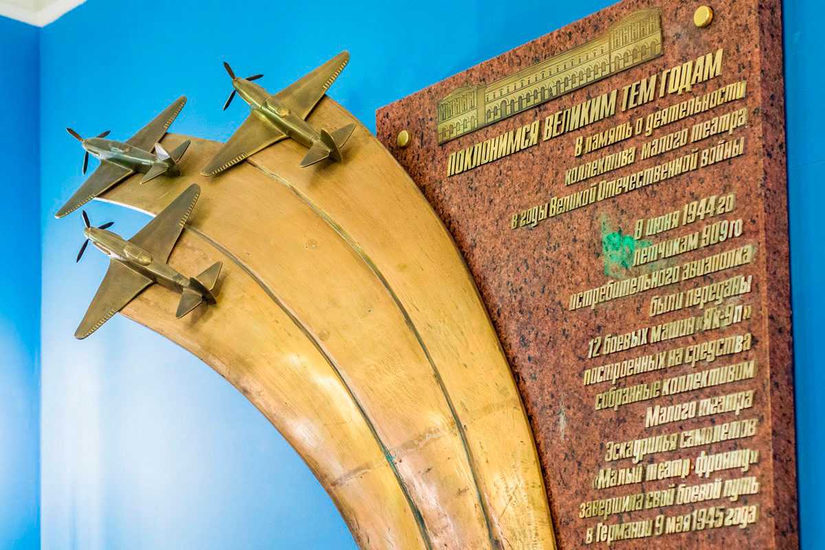 Памятная доска, посвященная жизни театра в годы Великой Отечественной войны, – первое, что видят зрители, сдав одежду в гардероб. Артисты Малого внесли свою лепту в Победу: одни отправились на фронт с оружием в руках, а другие показывал спектакли — в землянках, на палубах военных кораблей, в поле, в лесу. Бывало, что представление прерывалось сигналом к бою, и тогда зрители-солдаты поднимались с мест, а через какое-то время возвращались – те, кто мог. Артисты отказывались от премий, а на собранные деньги строили самолеты, которые называли эскадрильей Малого театра.