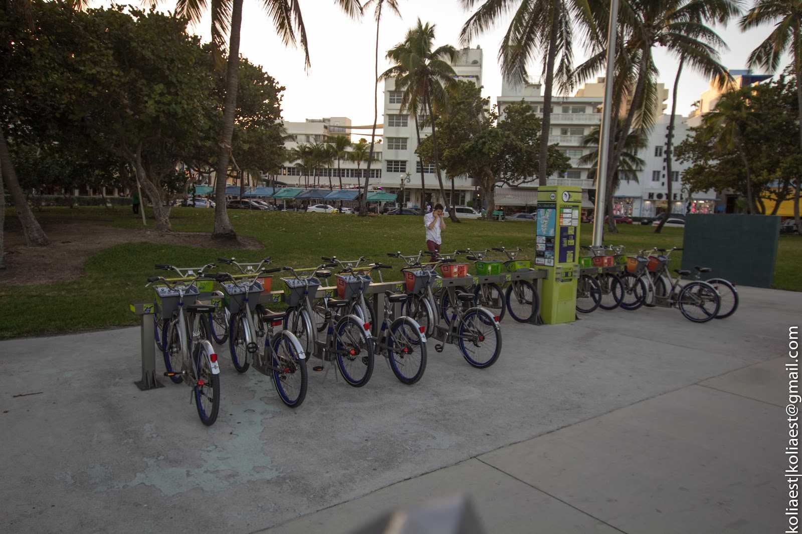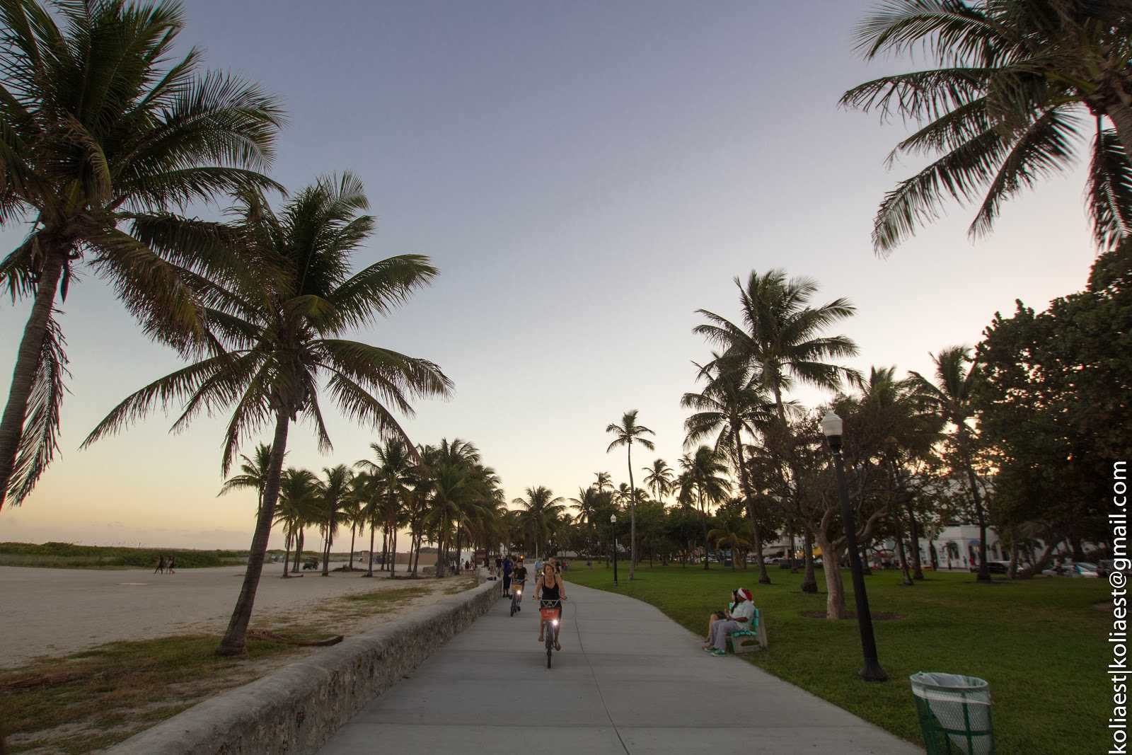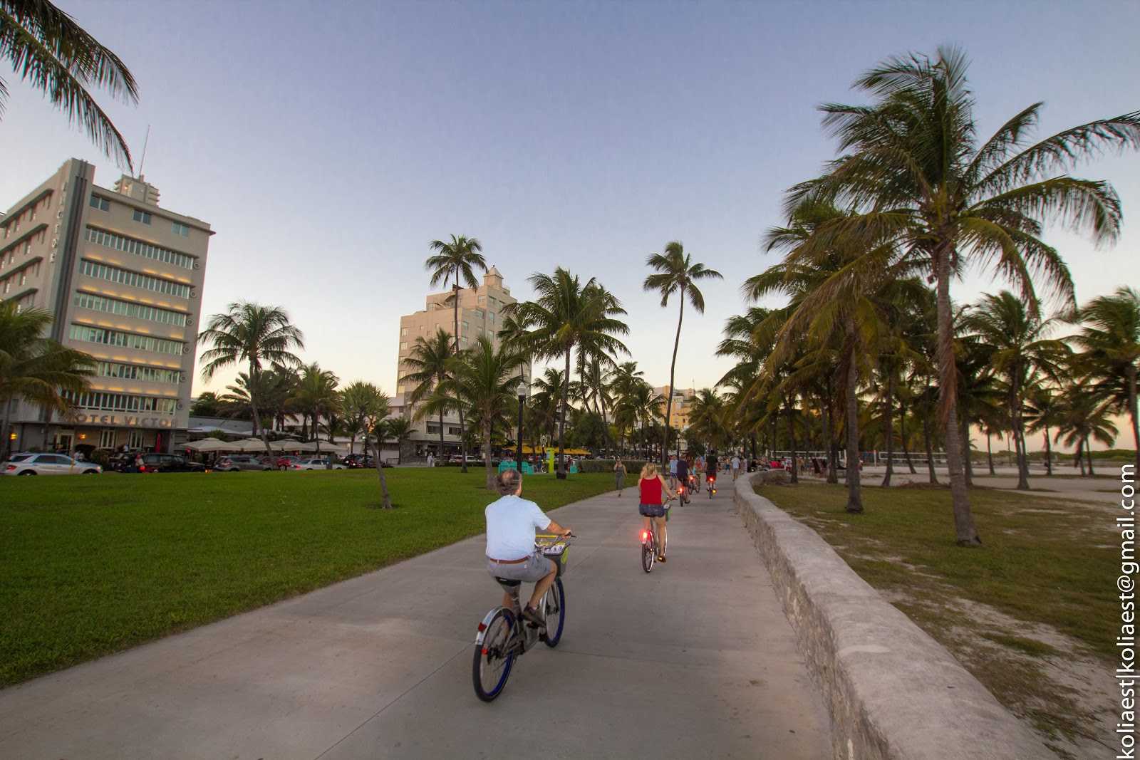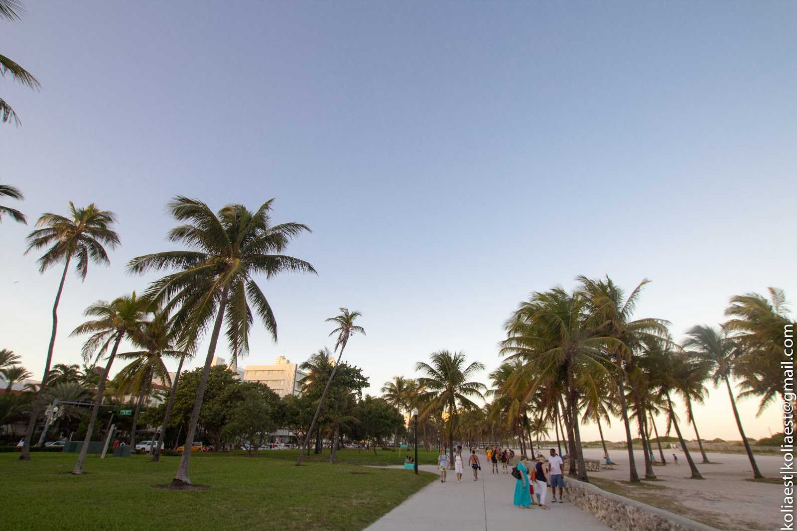 Пляж и Оушен-драйв разделяются полосой парка, в котором царит спортивная жизнь: на многочисленных турниках красуются перед друг-другом и перед остальными накачанные парни (сомнительной ориентации), по дорожкам проезжают группы велосипедистов, роллеров и любителей побегать.