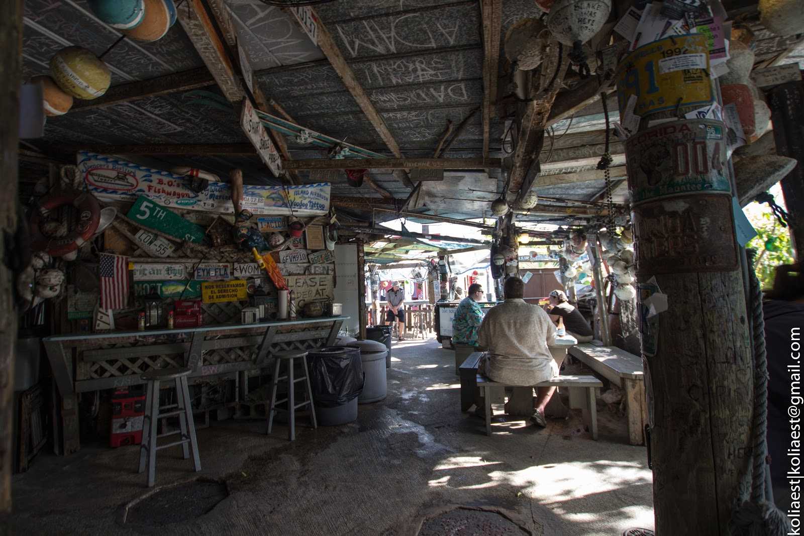 Интерьер заведения действительно впечатлил: на стенах висели автомобильные номера, потолок сплошь исписан мелом, а снаружи и вовсе невозможно понять, что же это за заведение