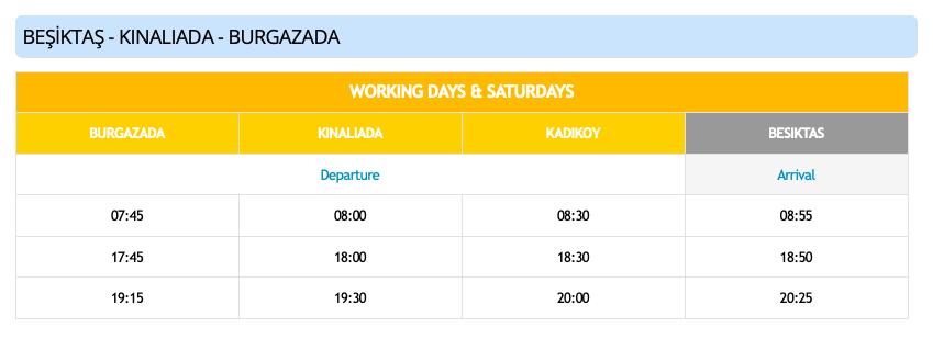 Расписание паромов с Принцевых островов (Бургазада и Кыналиада) до станций Кадыкёй и Бешикташ