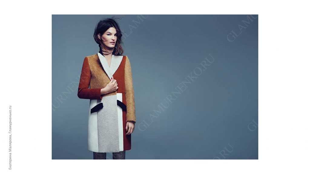 В первом случае на модели надет полушубок фиолетового оттенка с блоками черного и красно-оранжевого цветов. А во втором – пальто с зеленым меховым воротником, на фоне которого выделяется блок белого цвета. В результате получилась комбинация блоков: черного, зеленого, белого и пудреного по вертикальному краю пальто.