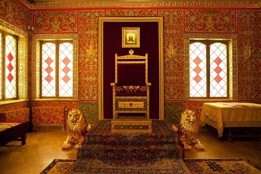 Современная реконструкция тронного места Алексея Михайловича в Коломенском дворце. Львы рычат и вращают головами — но эти эффекты достигнуты уже вполне современными средствами.