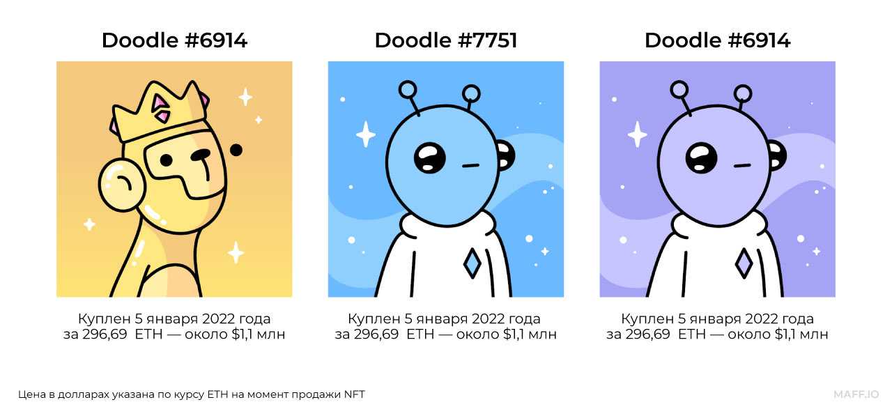 За первую неделю января 2022 года были совершены несколько сделок на вторичном рынке с покупкой самых дорогих NFT из этой коллекции. А пользователь под ником Pranksy купил редкую золотую обезьяну Doodle всего через 40 минут после начала продаж. В его коллекции из 30 тыс. NFT есть уже есть 71 Doodle.