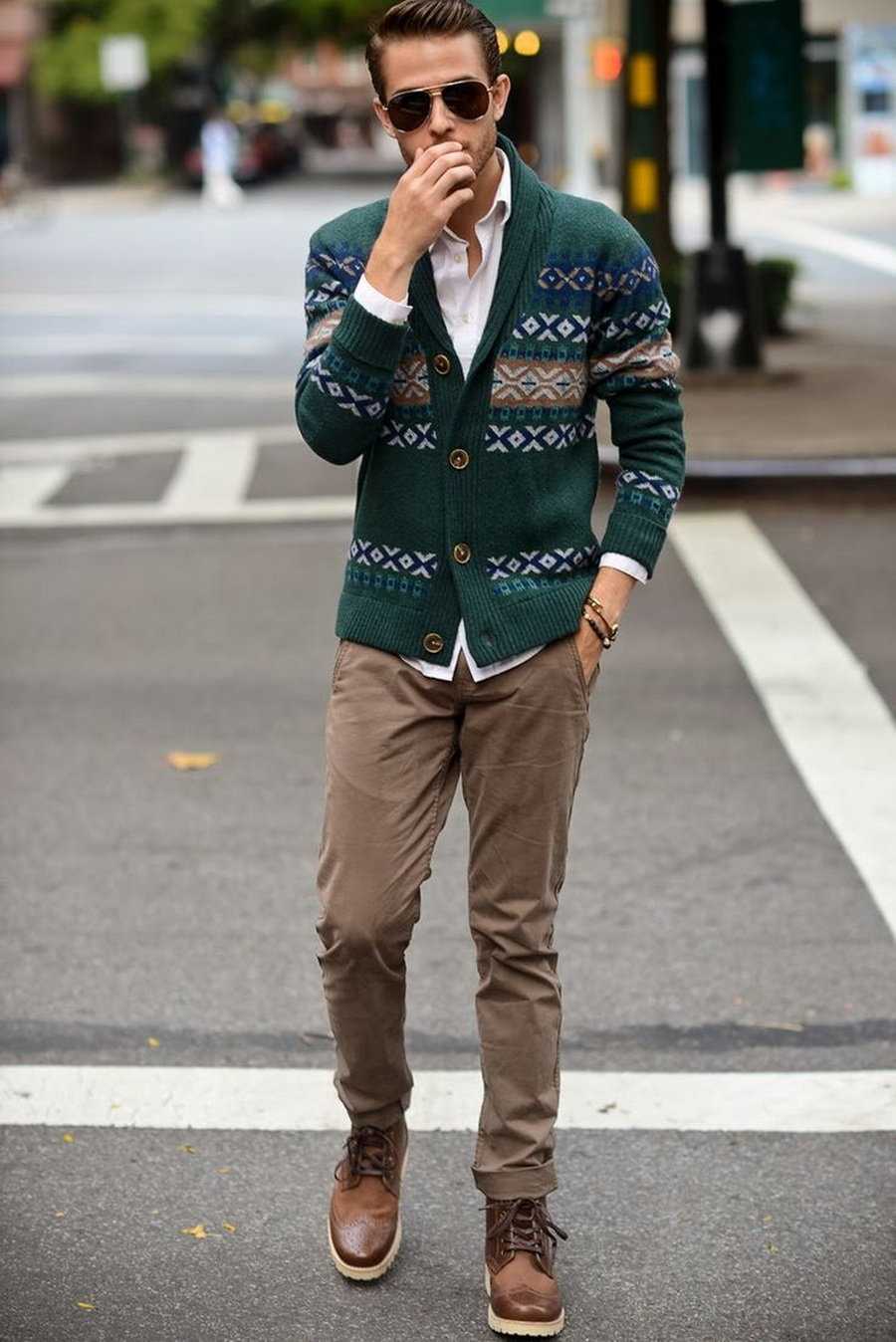 Ботинки. И конечно же, повседневный небрежный образ с зелёной кофтой в этническом стиле и потёртой обуви на толстой подошве – идеальное решение для модного сейчас «бомж» стайла.