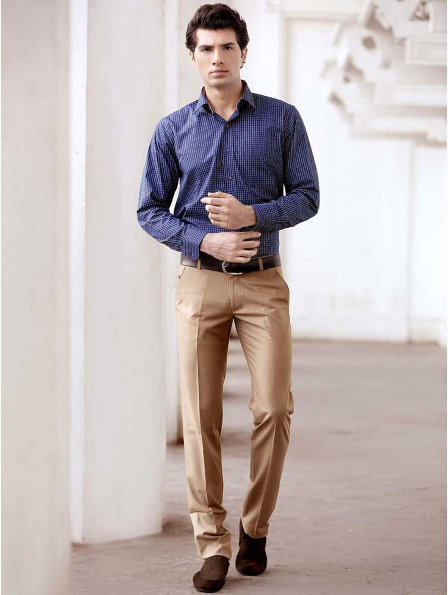 Идеальный цвет рубашки к любым коричневым брюкам – это синий. С ней образ получается ярким, брутальным, дерзким и привлекающим. С шёлковой рубашкой и классическими туфлями получается деловой лук, с голубой хлопковой и мартинсами – повседневный городской, с джинсовой – броский для вечеринки, с клетчатой – ансамбль для работы или повседневных дел.
