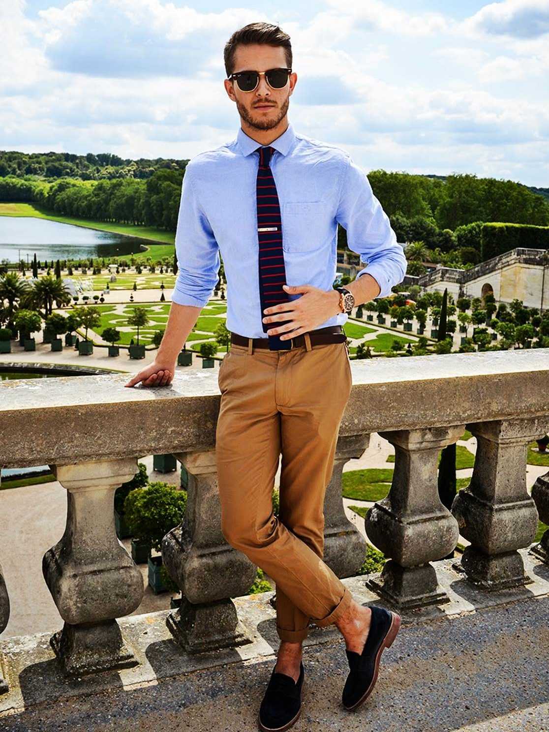 Мокасины. Замшевая обувь в деловом стиле замечательно комбинируется с классическими зауженными песочными брюками. Голубая рубашка и синий галстук – чудесное дополнение к ансамблю.