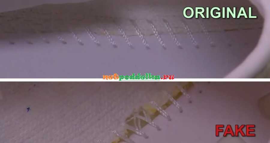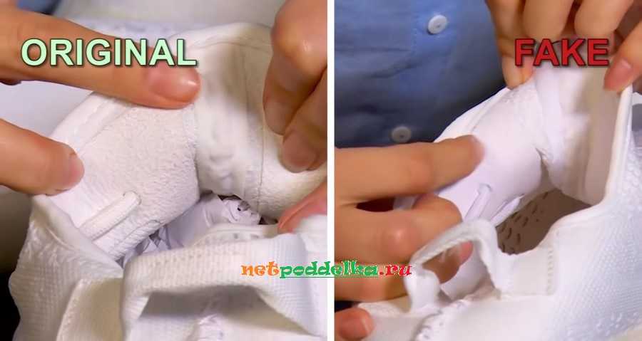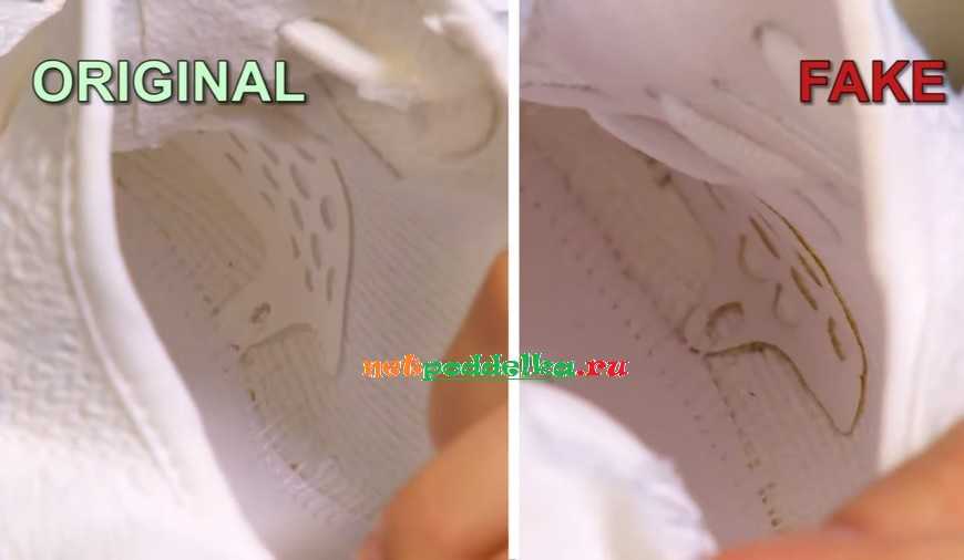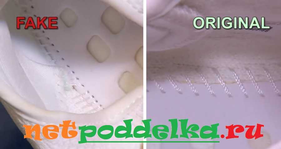 При изготовлении подделки многие элементы делаются из остатков ткани. Это проявляется по недостающим участкам и плохим швам. Часто можно увидеть торчащий поролон. У оригинала все элементы имеют достаточную длину, поэтому внутренняя и внешняя часть кроссовка сделаны аккуратно.