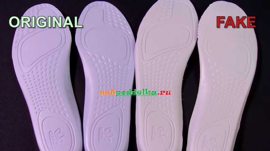 Разницу в качестве оригинала и подделки можно заметить, если приподнять стельку. У фальшивки там часто присутствует низкосортный картон, подтеки клея и прочие непозволительные фирменным кроссовкам дефекты.