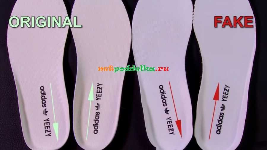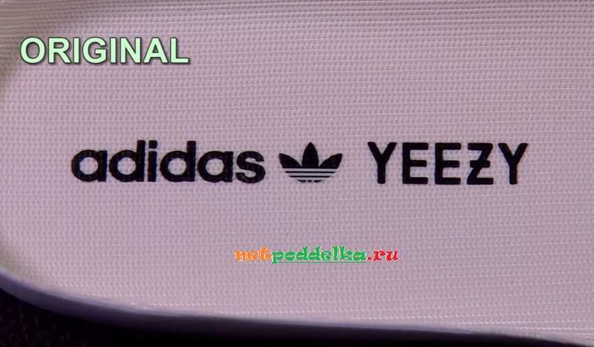 Все же осмотр стельки ‒ хороший способ как отличить Adidas Yeezy от копии. Выявить паль можно по мелочам. Например, у оригинала логотип цельный, а белые полоски на нем нанесены поверх. У фальшивки он состоит из нескольких частей разделенных между собой.