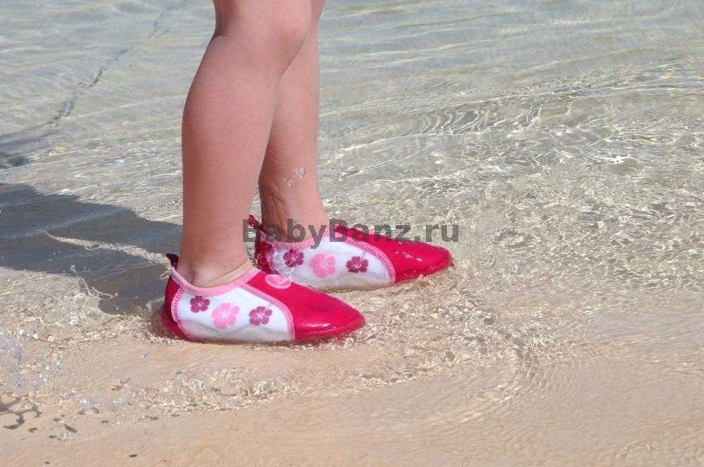 Особенностью модели считают застежку, которая находится на пятке. Она помогает фиксировать ногу ребенка и исключает потерю обуви в момент купания.