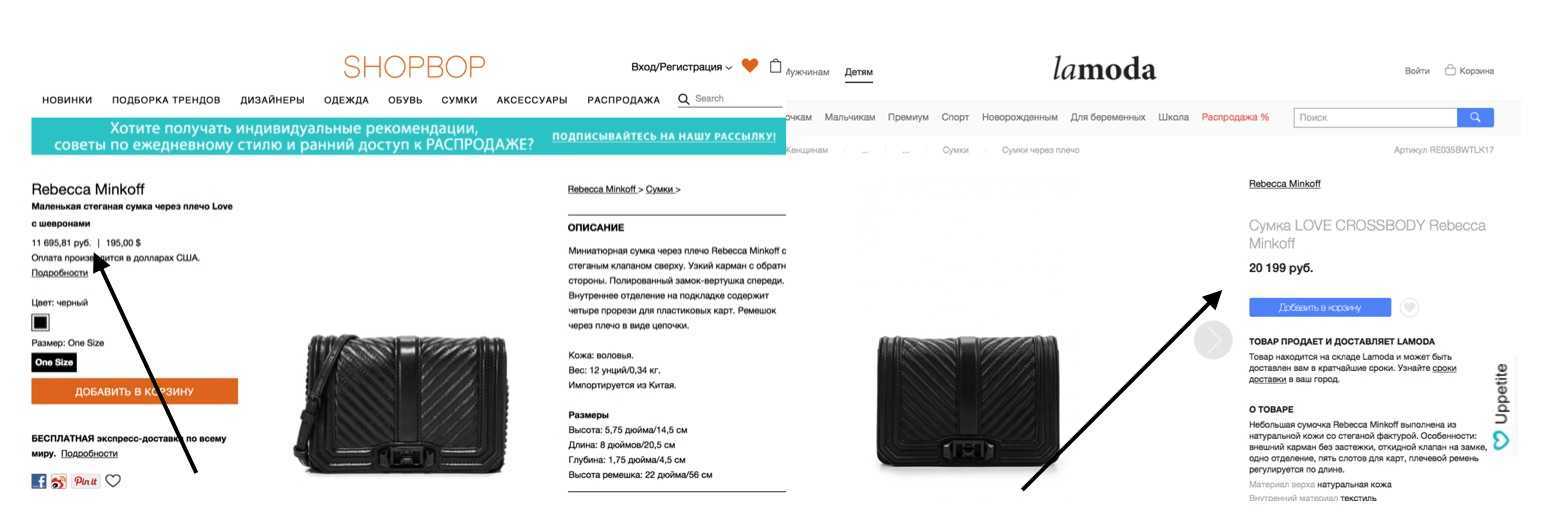 Посмотрите, цена на базовую сумочку Rebecca Minkoff Love на сайте shopbop.com меньше 12 000 рублей, а на Lamoda.ru больше 20 000 рублей! Приличная разница!